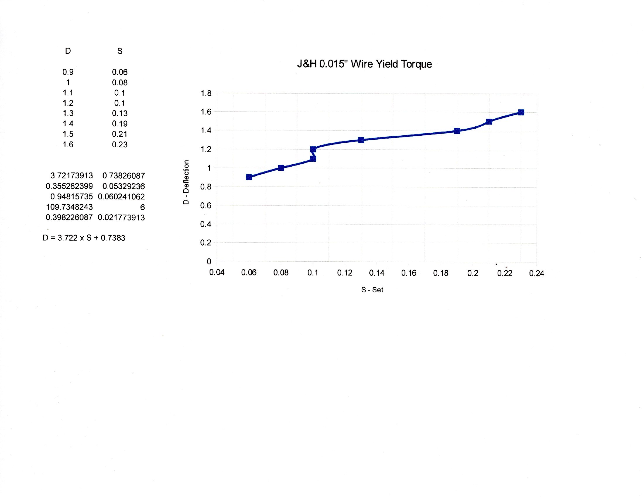 The table, upper left, shows the readings of deflection D and set S. The block of numbers below the table is the statistical least squares fit (LINEST) of a linear equation to the data, as shown below that block. The equation shows D as a function of S; D = 3.722 x S + 0.7383. The regression finds a slope of 3.722 and an intercept of 0.7383. The intercept of that equation is the value of D when S is zero. That is the maximum value of D which does not cause yield. That deflection corresponds to 265.79 degrees. The torsion pendulum test of this wire found 0.1623 gm-cm of torque per degree of deflection. Thus 265.79 x 0.1623 = 43.14 gm-cm = 0.5991 in-oz is the do not exceed torque for this wire. This depends only on the diameter and is the same for any length.
