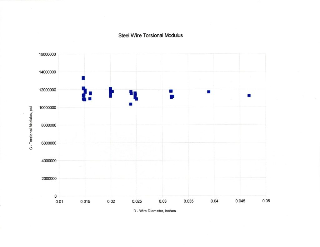 Here we run into a little bit of a problem. We need to know the yield stress of our wire. You would hope there would be a standard value, but there isn’t. Steel properties vary just as the properties of rubber vary from batch to batch. (I’m beginning to think they vary with temperature, too, as with rubber.) There is a parameter called yield stress τmax (tau maximum), but the values in the literature are all over the place, ranging from 21,000 psi to 177,000 psi. I won’t bore you with details, but the various collections have standard deviations around 50% of the average, not good enough even for preliminary design estimates.