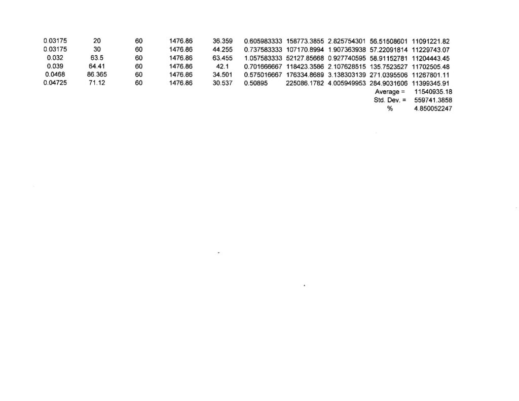 Draw a 15 cm circle on some heavy cardboard from a cereal or Graham Cracker box. (Larger diameter wire will require a larger diameter disk, as indicated in the I column in the table.) Cut it out precisely along the circle. Poke pinholes through the center and at a point 1/4″ off center. Weight it in grams to get its mass m. I find that the weight varies with atmospheric conditions, so it should be weighed before each test. Bend 1/16″ of one end of the wire to a right angle and another parallel right angle 1/4″ away to form a staple on that end of the sample that will fit into the holes in the disk. Bend 1/8″ of the other end of the wire at a right angle and parallel with the first end. Measure the distance between the bends in centimeters, this is the length L of the sample. Put this end through the center hole and pull it through until the staple engages the other hole and tape it securely in place. Clamp the 1/8″ end in a vise so the wire hangs vertically and the disk is free to rotate. Put a mark on the edge of the disk opposite you, so you can see the mark pass behind the wire as the disk oscillates. Rotate the disk to deflect the mark about 90 degrees and release the disk. As the mark passes behind the wire, start the stopwatch and count every time the mark goes behind the wire, going in the same direction, each full cycle. Count to some number N, typically 60 is good enough, and stop the watch. The watch gives the time t for N cycles. The swings will diminish, but the time interval will remain the same. Measure the diameter of the wire in inches at several places and find the average diameter D. I find that the wire is usually not exactly the nominal diameter. For example, for this test I measured the 0.015″ wire at seven stations, twice at each station, at right angles. The average of fourteen measures was 0.01485″ with a standard deviation of 0.51625%. That is the number to use in the calculations.