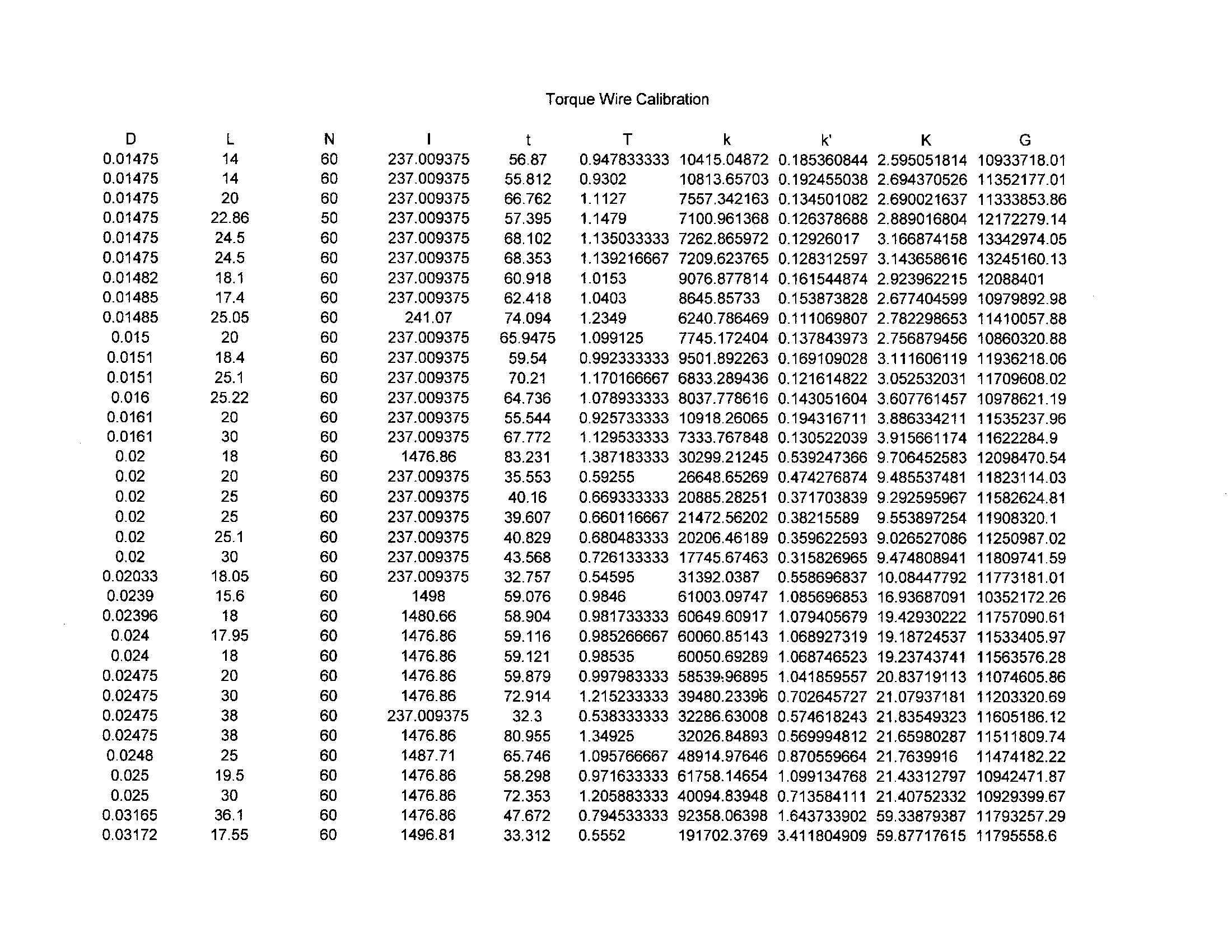 G is the coefficient use in the equation some sources use to calculate the ratio between angular deflection and torque. Note that its value is fairly consistent, standard deviation is only 4.85% of the average. Some sources say that G varies with diameter, but that does not seem to be the case. See the graph. If you want to use the G equation, the value of 11,540,000 is good. I would use this only for preliminary design estimates. If you want an accurate torquemeter, I recommend calibrating your own wire.